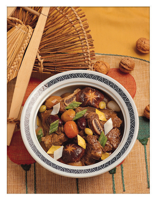- Rendam daging setengah matang, buah chestnut, wortel, lobak dan jamur di dalam sauce tambahkan pear, gula, daun bawang, bawang putih, bubuk wijen, minyak wijen , garam dan merica secukupnya selama 2 jam. Setelah 2 jam rebus kembali.